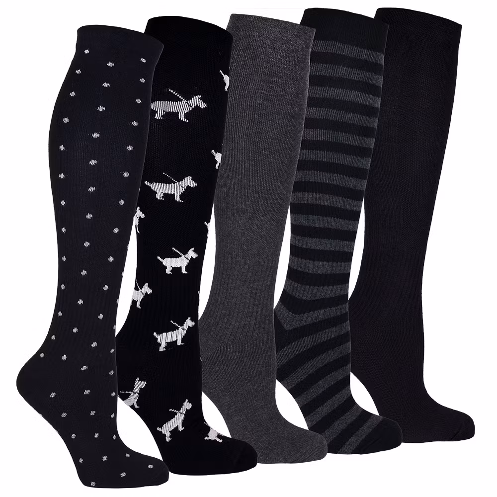 5-pak kompressionsstrømper med gradvis kompression for ekstra energi til dine ben. Fire par i fine mønstre og et par i marineblå.